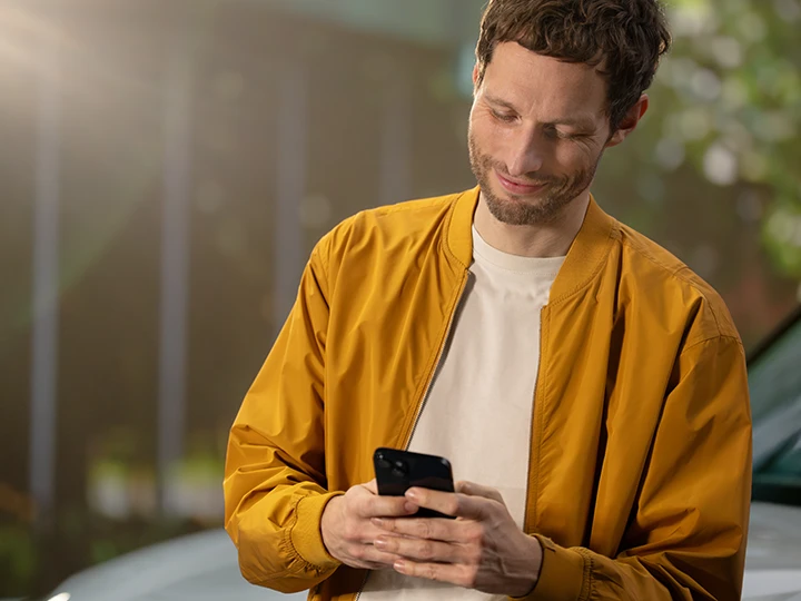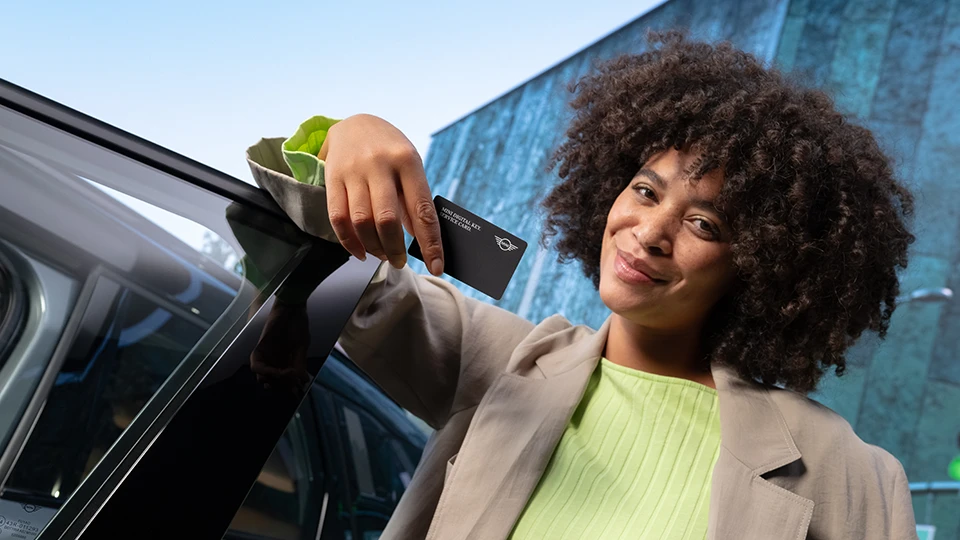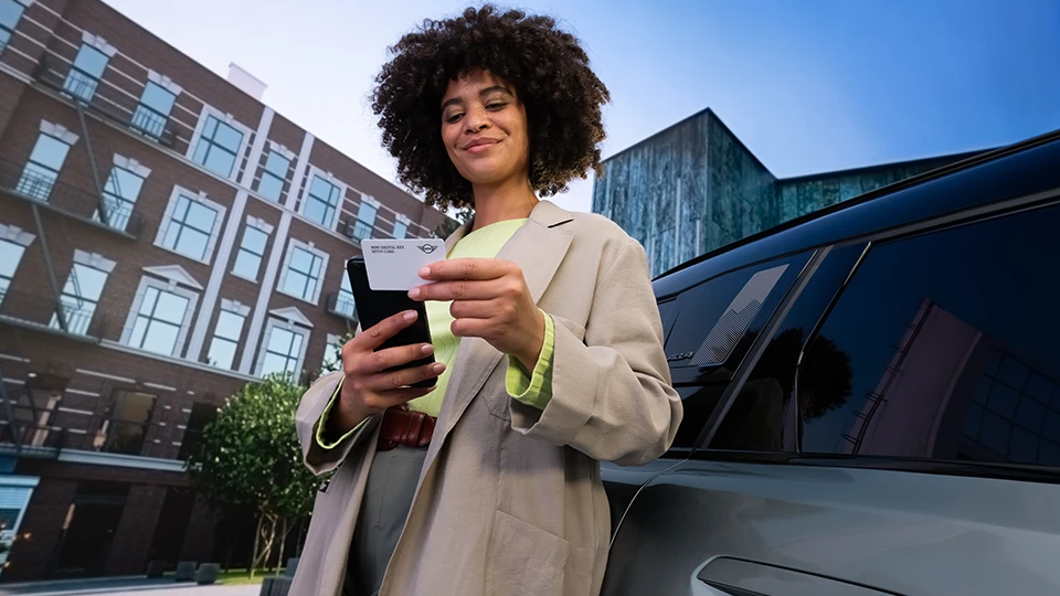 Depending on your country, model, and equipment of your MINI with MINI Operating System 9, you can unlock and start your MINI with the MINI Digital Key Plus using the "Teleservices" (6AE) and "Comfort Access" (322) options, along with your smartphone or smartwatch model. If your country and mobile device support the "Ultra-Wideband" (UWB) standard, your MINI will automatically unlock as you approach. Additional comfort features are available on your smartphone or smartwatch and in the MINI app. To start the engine, your mobile device just needs to be inside the cabin. If UWB is not supported, data transmission occurs via "Near Field Communication" (NFC), requiring you to hold your smartphone or smartwatch to the door handle and place it in the smartphone holder to start the engine.